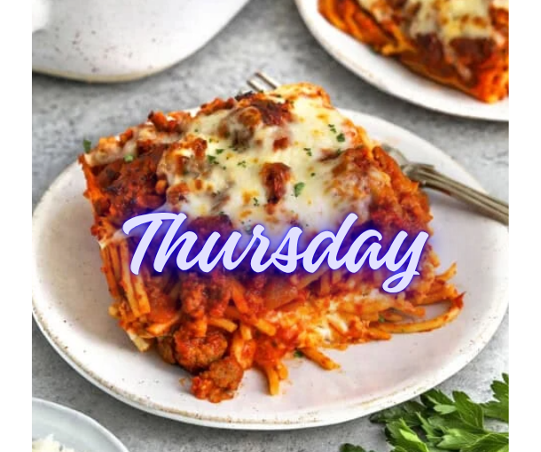 Thursday Baked Spaghetti, Caesar salad with homemade dressing and croutons, and homemade rolls with garlic butter.