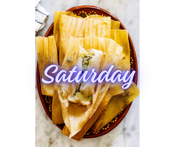Saturday Chicken Tamales (dozen) with Mexican rice and refried beans.