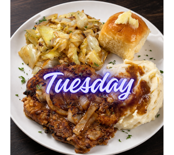 Tuesday Smothered Pork Chops with onions and gravy, mashed potatoes, fried cabbage, and homemade dinner rolls with brown sugar butter.
